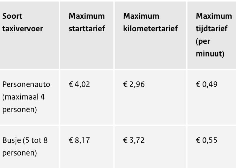 Stel, u maakt met een personenauto een rit van 7 kilometer die 15 minuten duurt. Als de taxivervoerder de maximum tarieven zou hanteren, dan zou deze rit kosten: